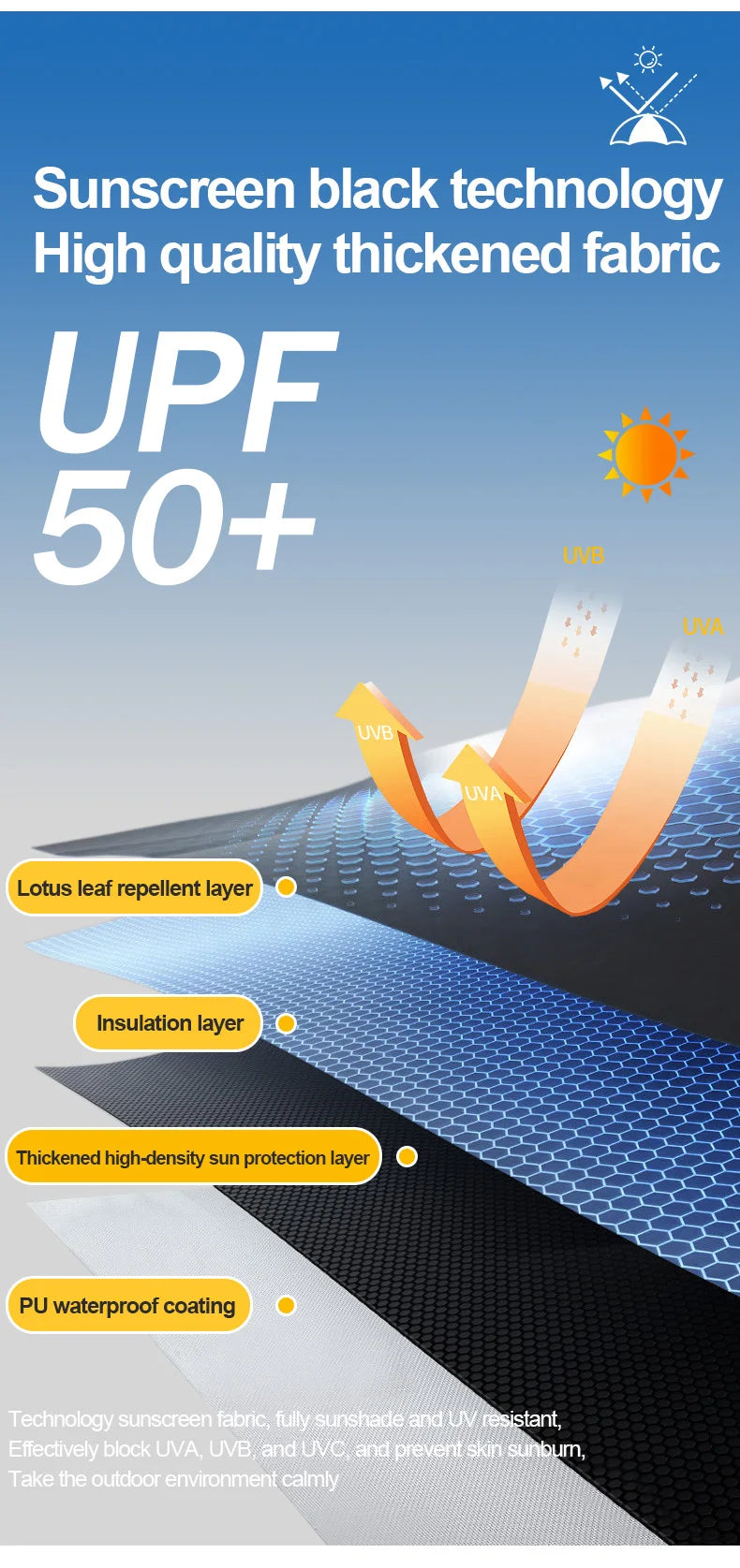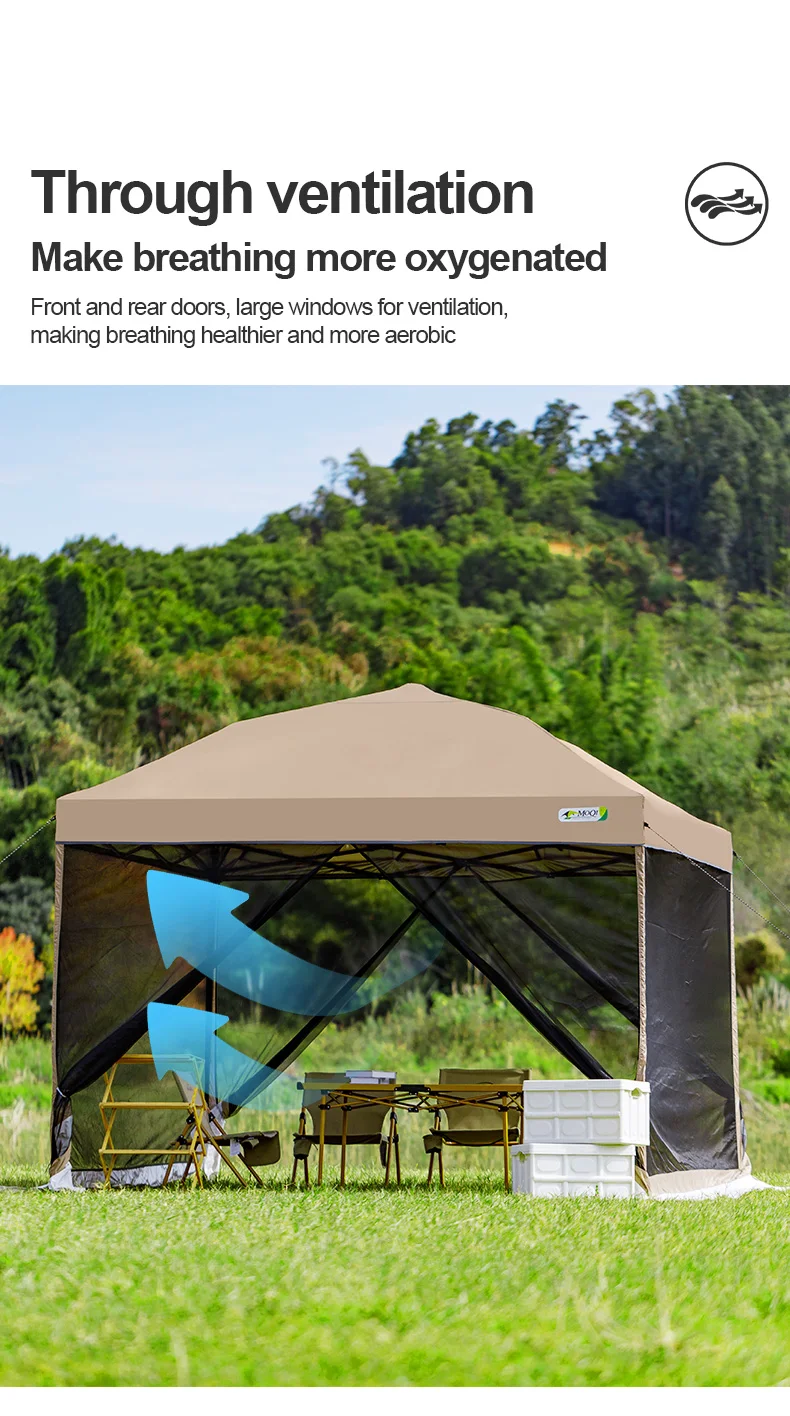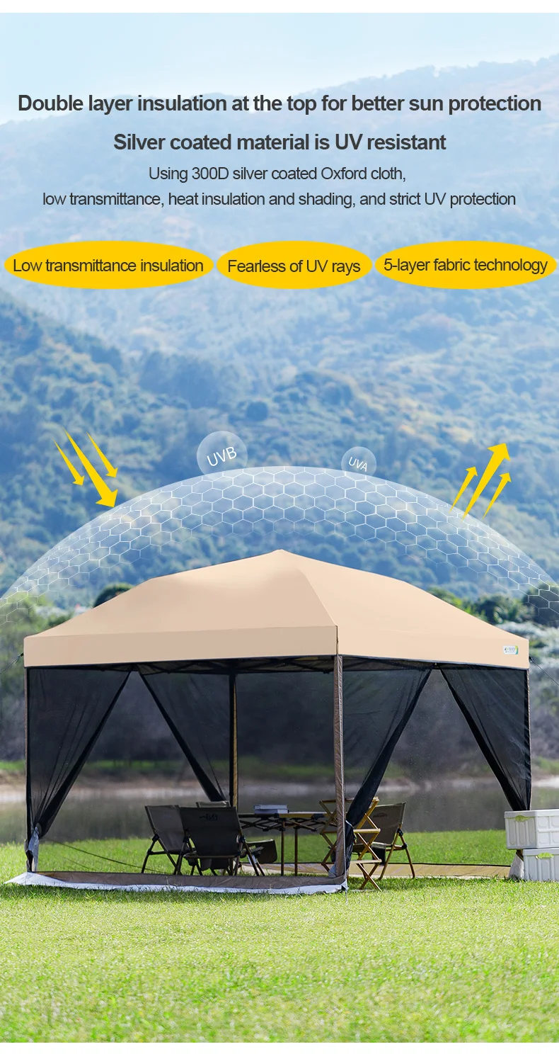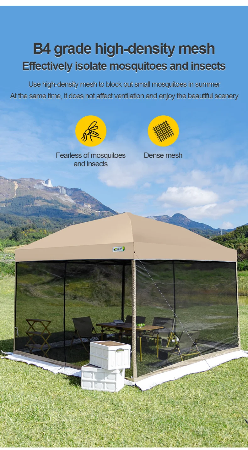 [Upgrade fabric] - The top cloth is 300D coated oxford cloth, and waterproof tape is pressed at the seam to prevent heavy rain and rainstorm. The side wall of the canopy tent is made of waterproof 150D oxford fabric, and the interior is coated with silver plated sunscreen coating, which can withstand various elements. PU 3000mm waterproof effect, sunscreen index UPF50+, can isolate harmful ultraviolet rays and quickly cool down. The four sided mesh adopts B4 high-density mesh, which is mosquito and insect resistant. The bottom is connected to a wind deflector design, which can be used all year round. The four layers of thickened fabric effectively resist strong winds and easily avoid adverse weather! Used to block sunlight, wind, and rain