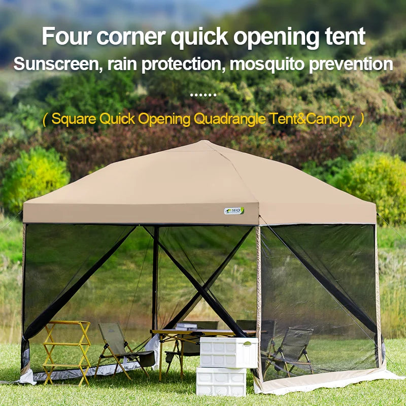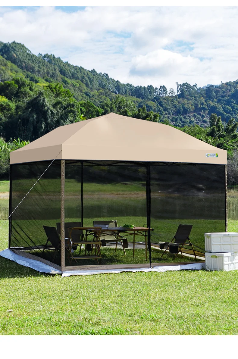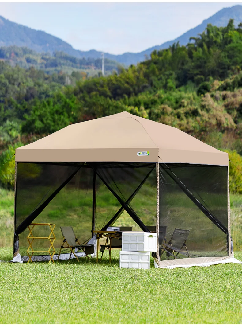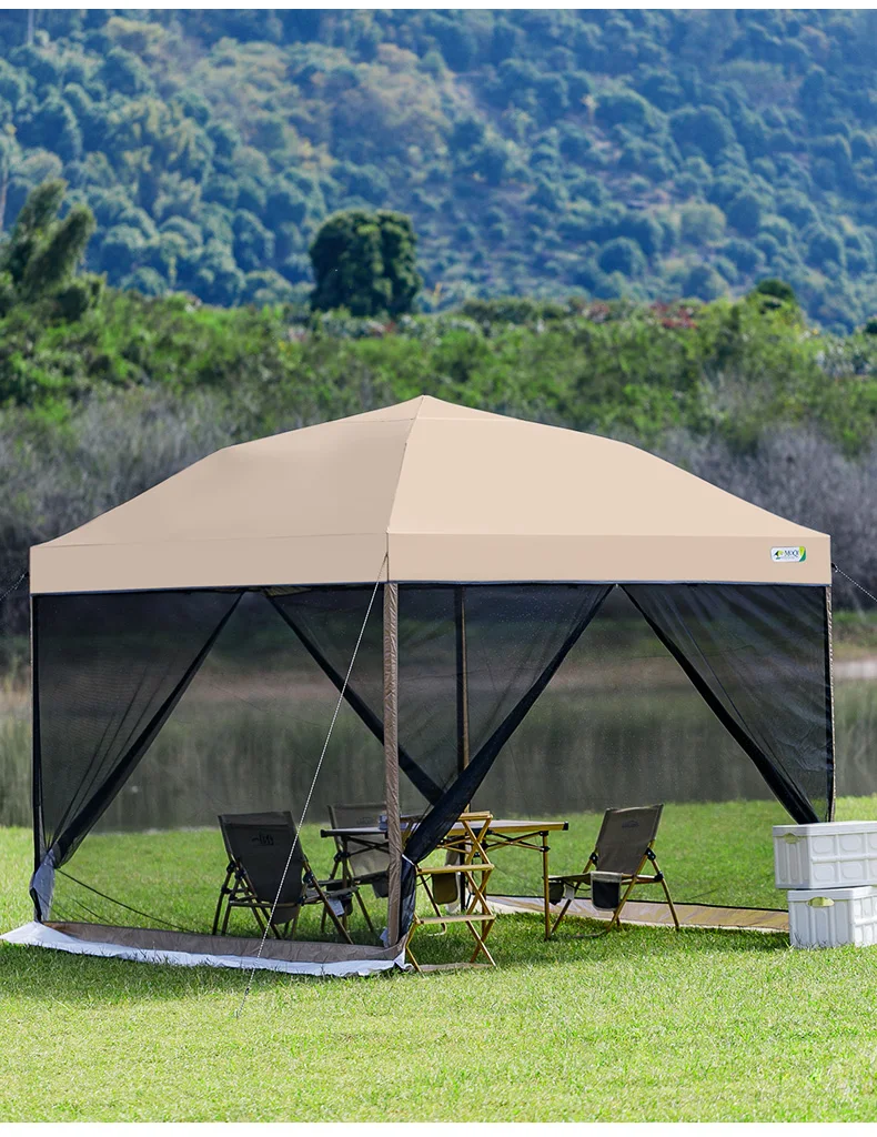 Outdoor pop-up awning beach camping instant canopy pavilion tent with side wall 10x10 feet khaki sunscreen rainstorm proof